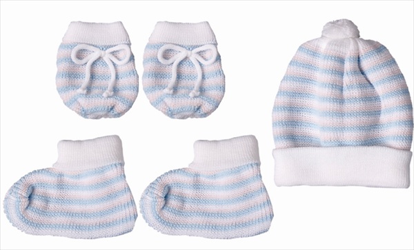 Pride ‘N’ Joy Combo Set consists of Cap/Bonnet, Mittens & Bootees. It is made of 100% acrylic with white base and colored stripes.